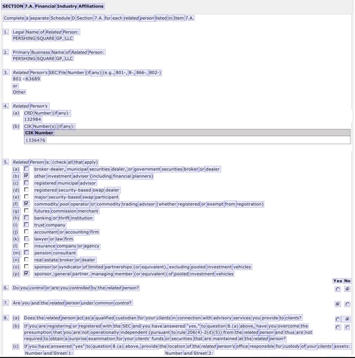To see this clearly, take the simplest possible case, a document that is trivially easy to read. Schedule D Section 7.A of a Form ADV Part 1A filing is a clean government form, and any competent vision-language model will perceive its contents correctly on the first pass. Perception is not where the failure happens. What the page contains is three different constraint types layered on top of each other. Item 5 is a sixteen-way “check all that apply” list of affiliation types, and ticking 5(p), sponsor or general partner of pooled investment vehicles, creates a cross-schedule expectation that corresponding fund entries appear in Section 7.B.1. Items 6 and 7 encode a control relationship through a pair of yes/no questions whose joint answer must resolve to a coherent structure. Item 8 is a conditional cascade where 8(a) no should null out 8(b) and 8(c), so an extraction that returns 8(a) no while populating 8(c) with a custody address has produced an assignment that cannot be reconciled with the form’s own logic. A sequence model can read every field on this page correctly and still emit an invalid assignment, because the decoder has no representation of the constraints that tie the fields together. The failure is not perceptual, it is structural.