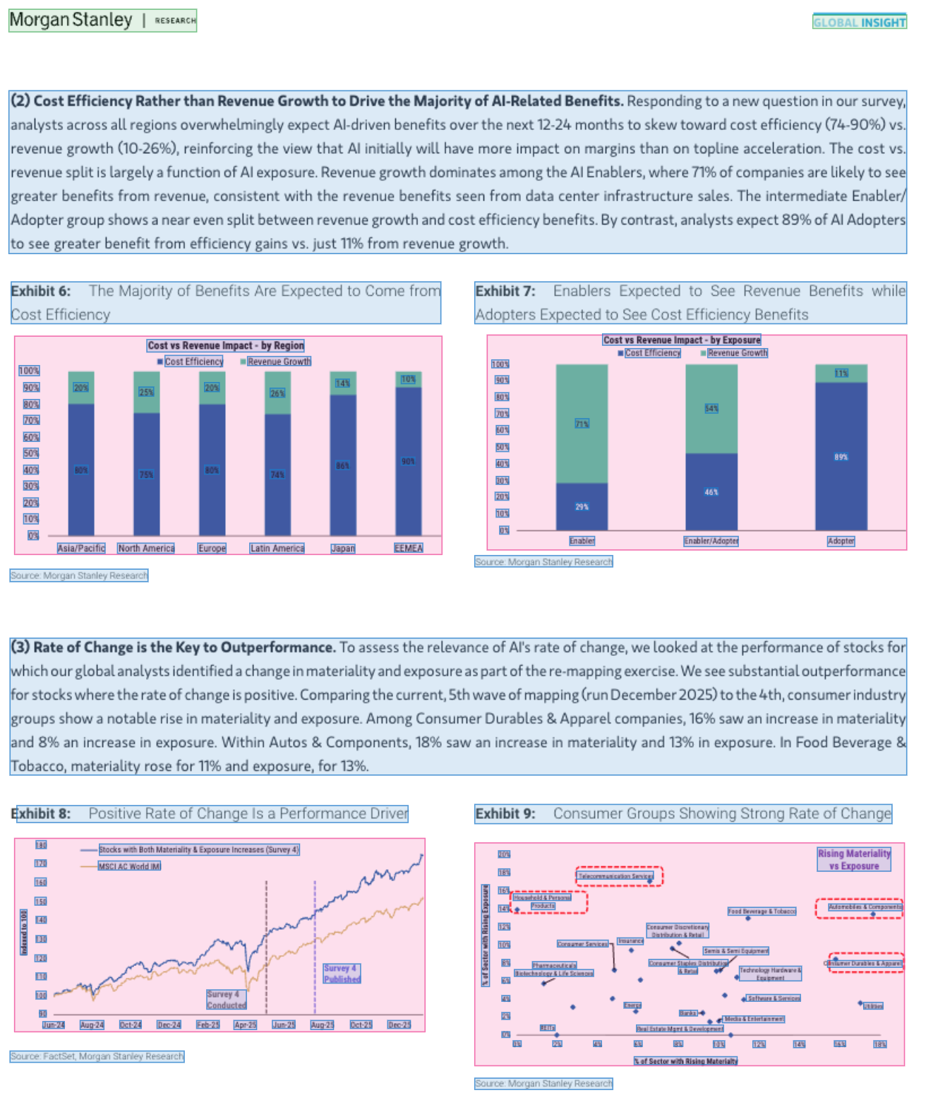 The same failure mode scales to documents where perception is harder and the constraints cross modalities. Take a page from a recent Morgan Stanley research note on AI adoption. The prose claims 89% of AI Adopters expect greater benefit from efficiency gains, and Exhibit 7 shows exactly that number on the Adopter bar. Each stacked bar in Exhibits 6 and 7 must sum to 100 percent, a linear equality over every column’s cost-efficiency and revenue-growth values. And the three sectors the prose calls out for rate-of-change analysis, Consumer Durables & Apparel, Autos & Components, and Food Beverage & Tobacco, must be the same three sectors highlighted in Exhibit 9, with matching materiality and exposure percentages. A sequence model can extract every number correctly and still produce a document where the prose statistics disagree with the exhibit values, the stacked bars fail to sum, or the sectors cited in the narrative do not match the ones annotated in the scatter plot. The constraints are cross-modal, the failure is still structural, and a constraint-aware decoder enforces consistency during inference rather than discovering the mismatches downstream.