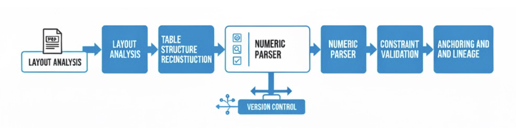 - Lineage. Every output carries a verifiable path back to the source page and geometry.