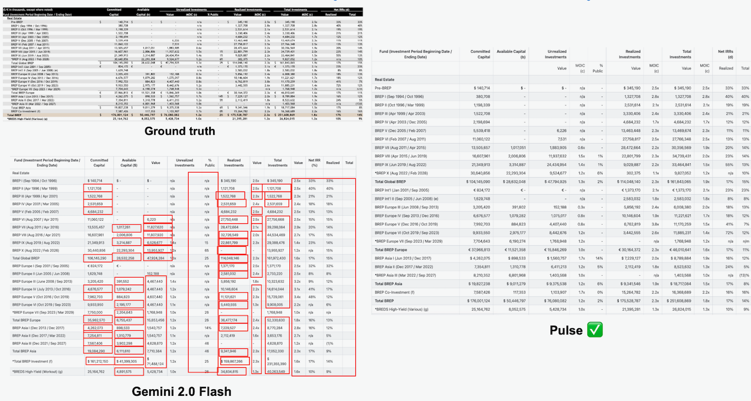 As you can see in our comparison with Gemini 2.0 Flash on a private equity CIM, the LLM shifts columns and hallucinates ~50% of values. We have many examples like this, across all industries, so let us know if you want to see more!