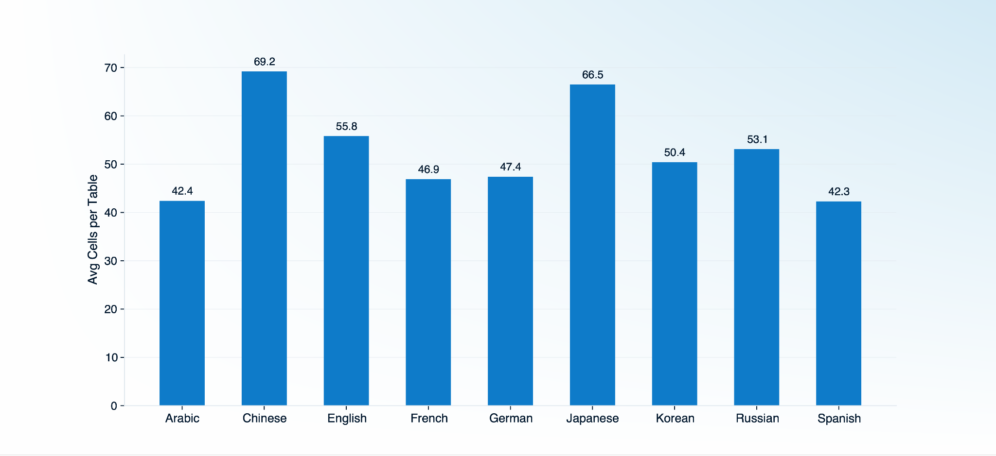 Tables range from simple (27.5% have 20 cells or fewer) to highly complex (4.0% exceed 200 cells), providing coverage across the difficulty spectrum teams encounter in production.
