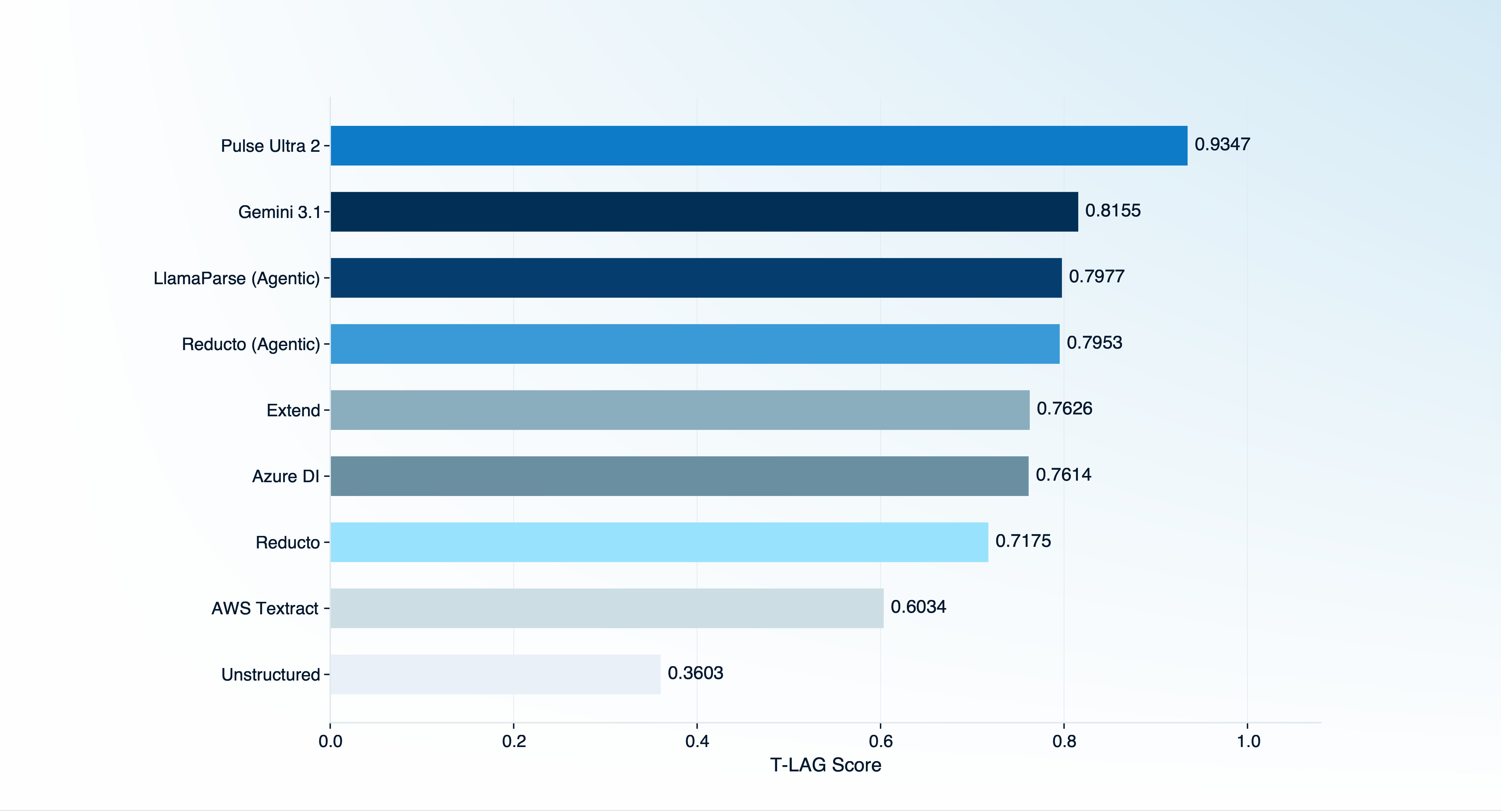 We're announcing PulseBench-Tab, a frontier open-source benchmark focused on table extraction. PulseBench-Tab is a multilingual benchmark with 1,820 human-annotated tables across 9 languages, each presenting its own set of challenges: handwriting, rotations, low-fidelity scanned images, and more. Alongside the dataset, the Pulse research team developed a novel scoring metric (T-LAG) that captures structural accuracy and OCR quality in a single unified score.