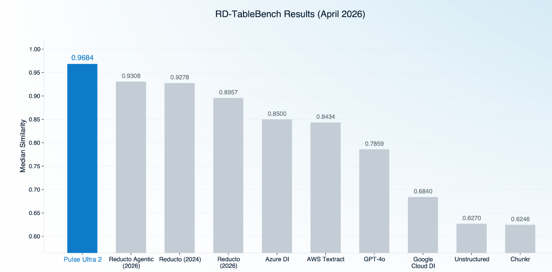 RD-TableBench, published by Reducto, is one of the benchmarks used in the space. The dataset, provider outputs, and scoring code are public. We ran Pulse Ultra 2 through RD-TableBench using Reducto's published ground truth and their published Needleman-Wunsch scoring methodology, with no modifications and no corrections, on the same evaluation pipeline Reducto uses to score its own systems.