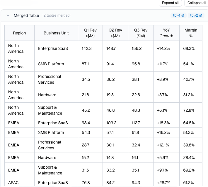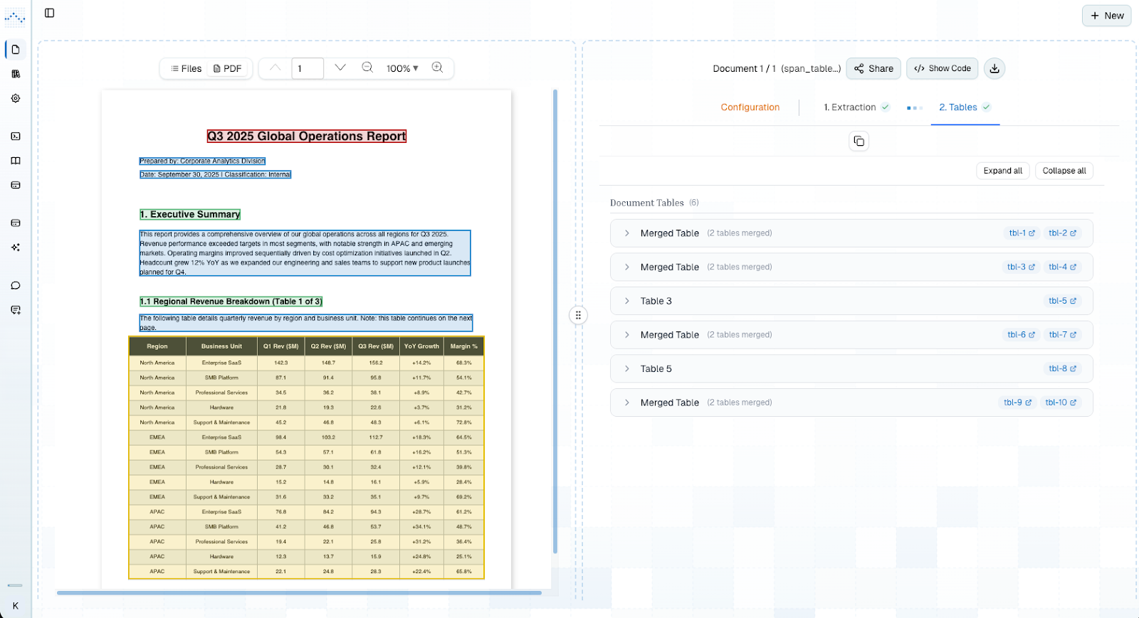 The screenshots below show this in practice. The source document is a quarterly global operations report containing a regional revenue breakdown explicitly labeled "Table 1 of 3," a table that starts on the first page and continues across the next. Without any manual configuration, our platform identifies the specific table tags with bounding box coordinates as belonging to the same structure, merges them, and surfaces a single unified table in the output panel, labeled clearly as "Merged Table (2 tables merged)."